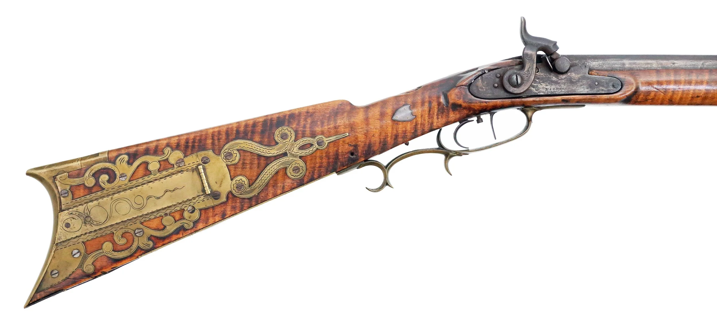 Summary: Rifles by Henry T. Killen are extremely rare with only two examples known, one from his brief Kentucky period in 1825-1827, and one from his early Tennessee days circa 1830. Both rifles exhibit superior quality with large patchboxes, fine engraving, and related silver inlay work. Strong similarities are seen in the two guns’ stock architecture, forestock inlays, barrel length, and engraved details, despite the later rifle showing Killen’s evolving style that was moving away from his earlier Bardstown training. The Tennessee gun has been known for many years, but it took another 40 years for a second Killen rifle to appear, an unexpected [but long anticipated] “ghost” rifle from his early years that documents his Bardstown training. Today, collectors are looking for a signed Killen rifle from his later Illinois years… but that “ghost” remains elusive and leaves collectors speculating again… perhaps for another 40 years.