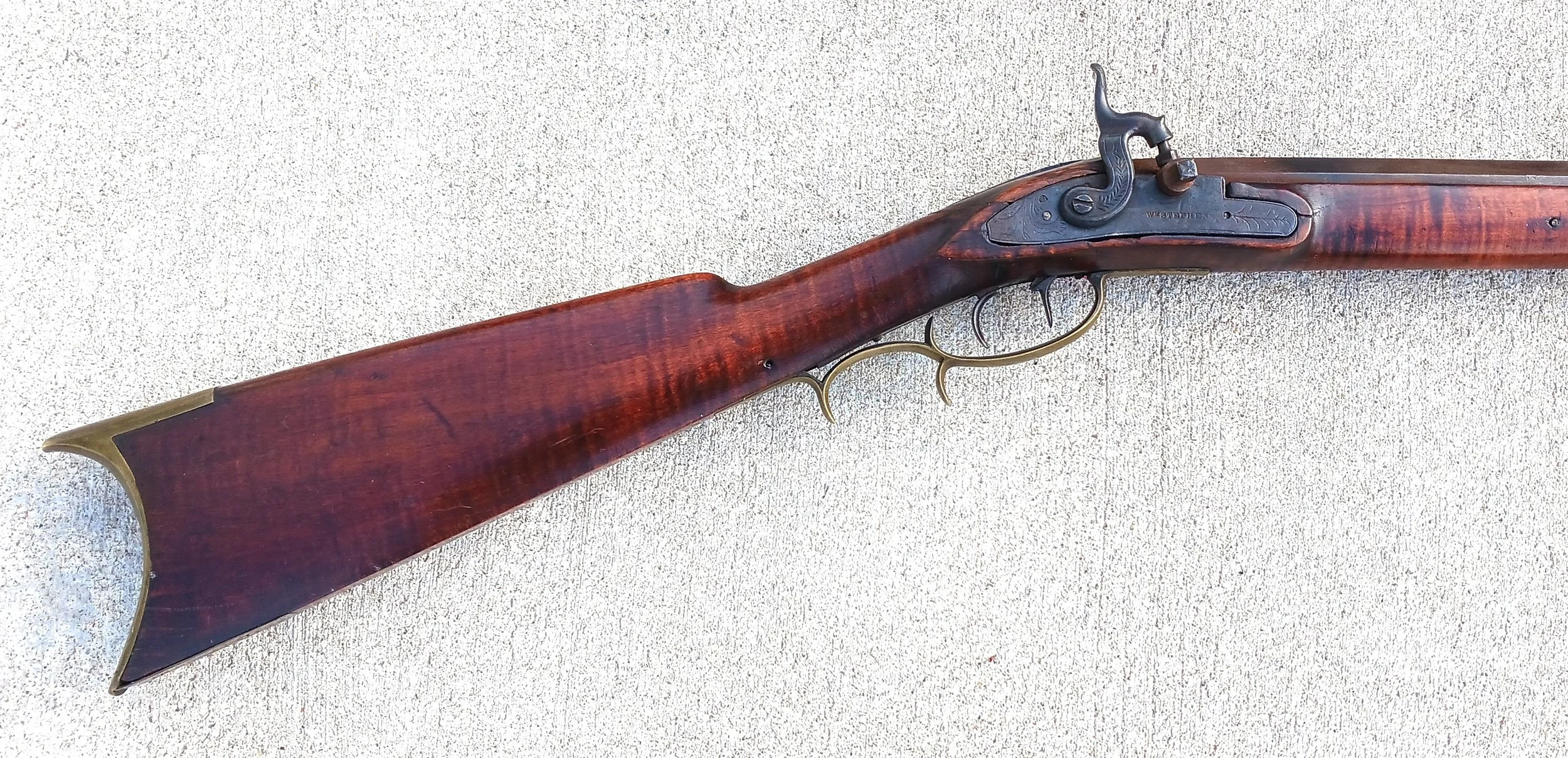 Figure No.3: The Stephens rifle has Kentucky’s typical triangular butt and nice ovality in the guard’s bow. While hard to see here, the lock is stamped “Wm Stephens” similar to the barrel.