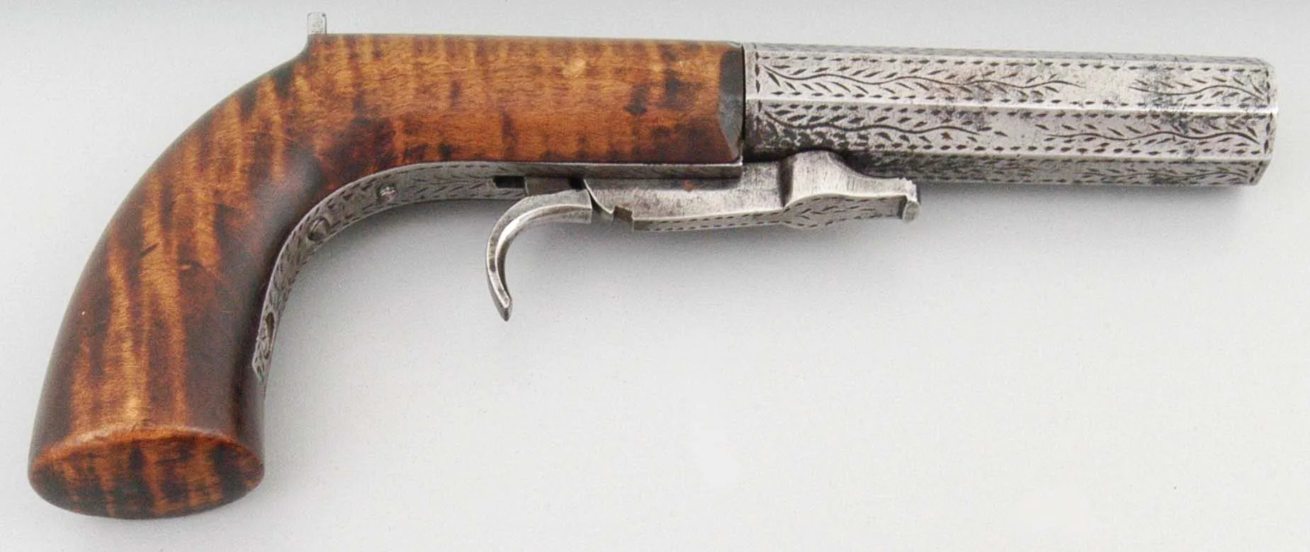 Figure No.3: The “E. C. Burden” pistol’s extended tang has vine-like engraving with dotted borders. The opposed vines flowing out from a center point reminded the author of another small under-hammer pistol he had seen with similar engraving and signed “J. Barlow.” Author’s photo.