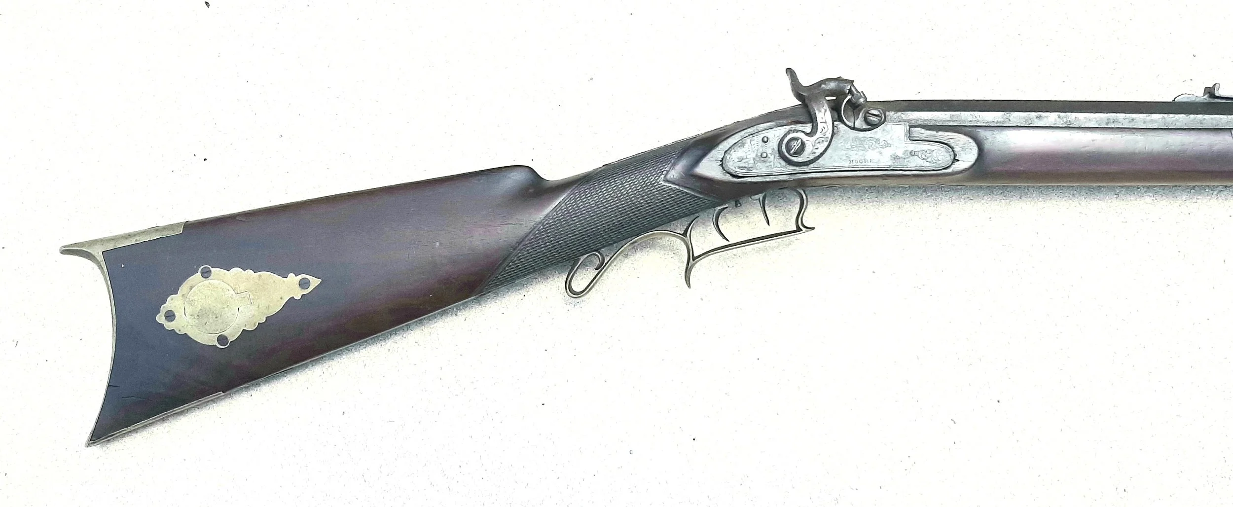Figure No.2: The front of the Calvin Oak rifle shows its walnut stock, German silver mountings, and fancy cap box with acorn finial. The gun is well-made, nicely checkered on the wrist, and has survived in very good condition.